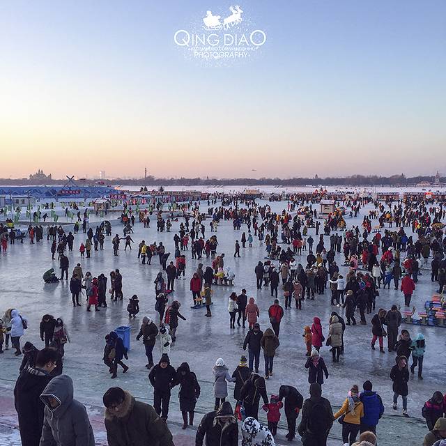 从中央大街走到头就是防洪纪念塔广场,广场那就是松花江,冬天时江上结冰很厚,上面开发了很多的娱乐活动,如滑橡皮圈、滑冰车等,好多没见过的稀奇玩具。根据不同项目,收费20-100不等。