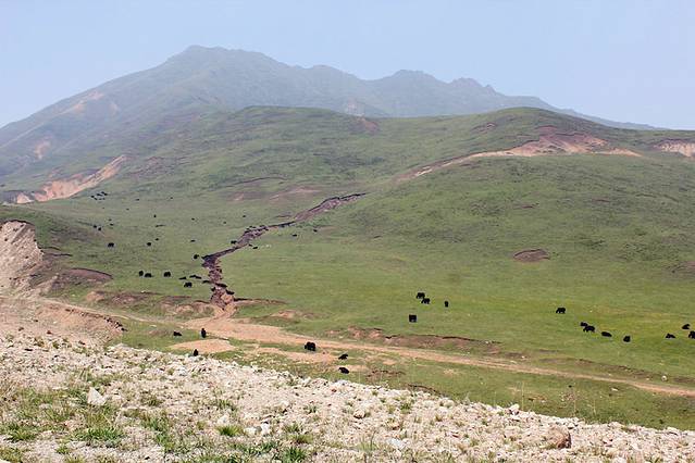 山坡上的黑点点都是牦牛~