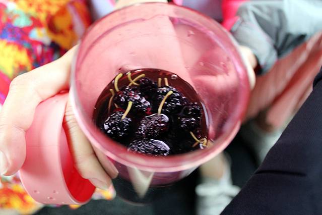 差不多两个小时后出来联系了于爸~结果一上车于爸就说:“女儿们,看看车上多了什么?”我们找呀找 于是发现了这个!满满一大杯桑葚!是于爸在我们玩的那段时间捡的~超级感动!!!