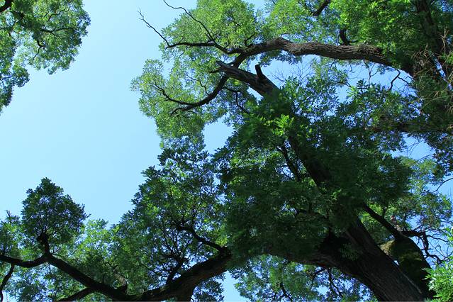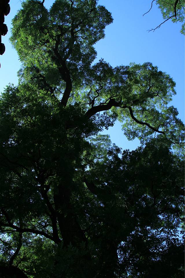 我第一眼看也惊了,因为这一个围墙里光看着像单独一棵树的就有4棵:(以图片位置来说)最近的这两个卸叉,中间的灌木 还有最右边曝光过度的一枝粗叉(和这边两支粗细差不多)。单独哪一个都不像是2500年的。