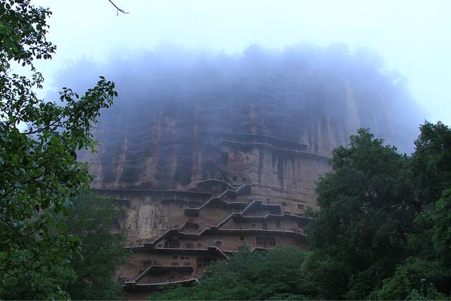 说说天气吧,头天朝霞漂亮,今天本应是个大晴天,可是麦积山所处地区也许是雨刚停的缘故,我们早晨进去的时候竟然看到了“秦州十景”之一的“麦积烟雨”。