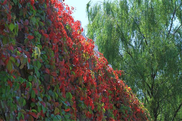 这刚几月啊,两边的爬山虎叶子已经变红了,而且还是那种通透的红。
