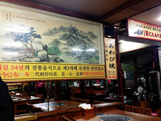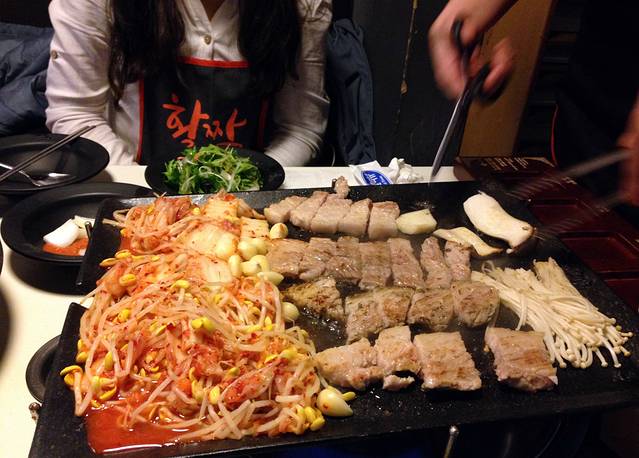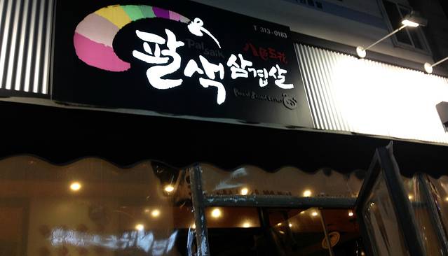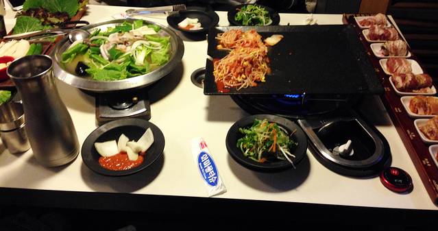 找到这家店,一进门,服务员把我们带到座位上,我还没脱外套坐下已经有人推了车过来给我们的桌子上菜!先上了锅酱汤,然后蔬菜盘,沙拉,我还以为上错了,结果那是基本配置,服务员快速给我介绍了8色烤肉和3色烤肉我们毫不犹豫选了8⁄(⁄ ⁄•⁄ω⁄•⁄ ⁄)⁄,一点完马上肉也上来了,桌子上一一盘各种生菜蔬菜,一大锅酱汤(海鲜酱汤!送的!)一人一份沙拉,烤盘上一堆泡菜豆芽,还有八种腌过的五花肉, 八色是指:咖喱、花草、红酒、辣椒酱、大酱、大蒜、松叶、人参这些酱腌渍过的肉。