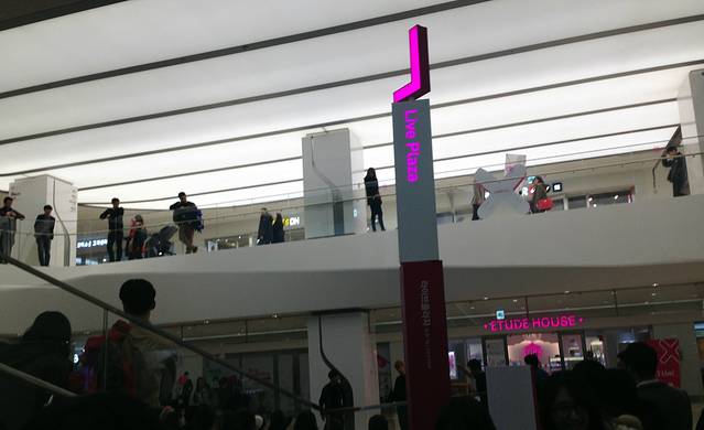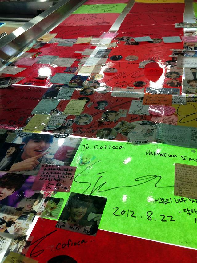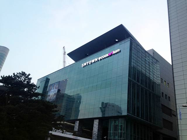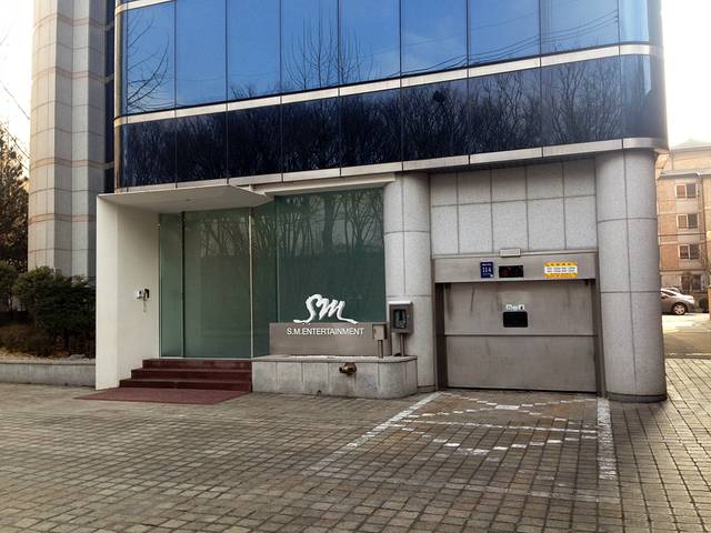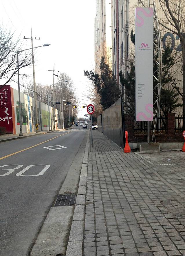 又去找sm,看着攻略的描述是旧楼是一栋小黄楼,看着地图标注的地方来来回回走都没找着,抬头一看,有一栋挂着巨幅少时的海报∑(っ °Д °;)っ 可是绕着楼一圈都没看见有门( ̄_ ̄|||) ,于是去找新楼,这个地图也没标注了,我们就凭着感觉走(喂。。是有多随意),其实是在那栋挂了海报的楼旁边的斜坡上遇到几个漂亮的韩国人妹纸,听她们在说SM什么什么的,我们猜应该在附近了( ̄_ ̄|||) 所以顺着斜坡上去,再下坡,右转,是一条夹道有很多树的马路,一直走,会经过一间中学,一个高级住宅区,反正一直走,就能看到sm,ps:我觉得我们是没领会好攻略所以绕路了(因为真的走了好久),要去的妹纸可以多参考一些攻略,有些是经过别的公司再到sm的。