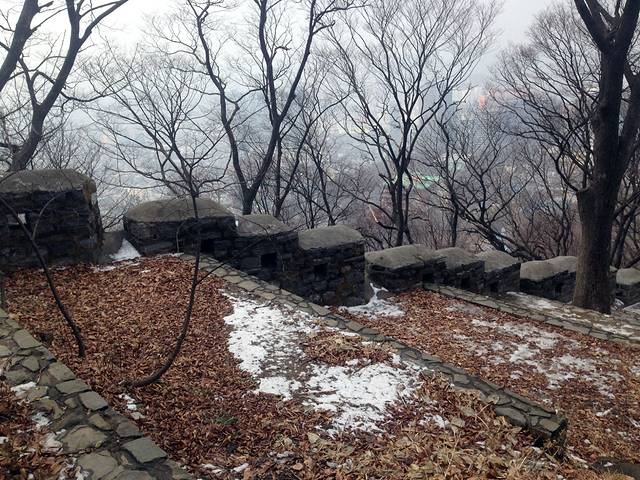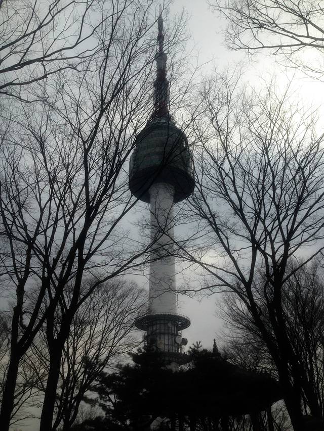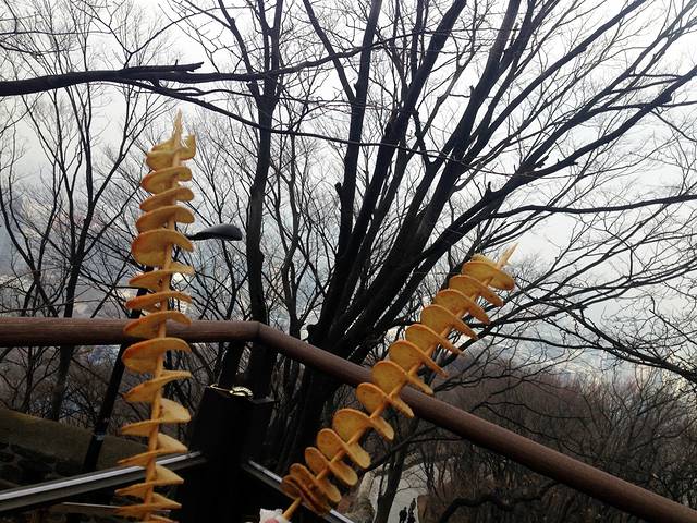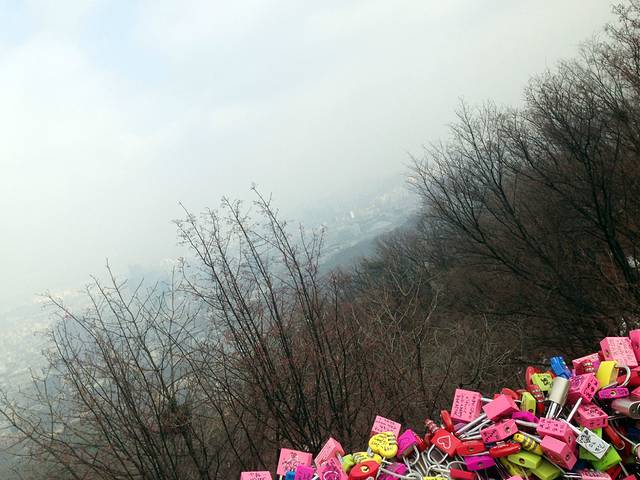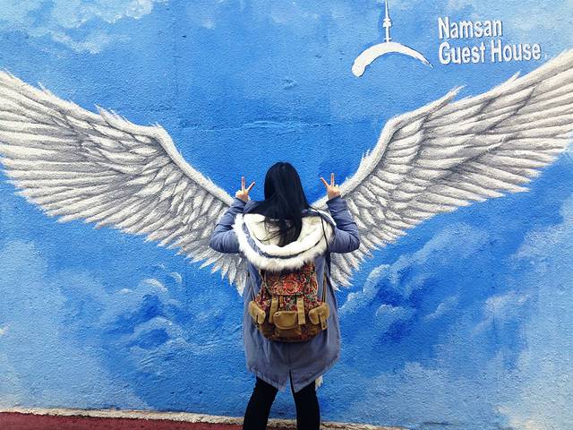 地铁3号口出来,看到7-11,从旁边的路一直走,会有很长一段上坡路,非常长,还挺陡,(韩国真的很 多坡路,要穿舒适的鞋子哦!)走了大概有10几分钟,路上会见到一个民宿的一个艺术墙,一对大翅膀!当然要留个影咯。然后继续走,看到正官庄,就能看到坐缆车的地方了。缆车双程是8500每人,到的时候是午饭时间人比较少,但也稍微排了一下队,缆车全程大约2分钟,俯瞰山啊城啊风景超美。上去之后吃了旋风土豆(3000),看锁,各种拍照,然后上塔。