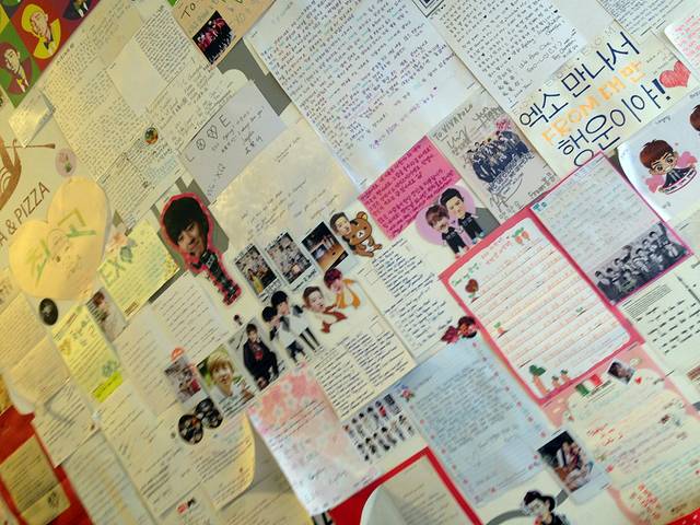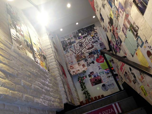 上午出门先去我们灿烈妈妈的店,VIVAPOLO,(这里有介绍:http://www.hanyouwang.com/a/31-1905.html)是家意大利餐店,在5号线明逸站,有点远,需要1小时左右的车程。1号出口一出来,抬头就能找到标志啦!店里真的是满满的fanart和给灿烈的小情书呀!(*/ω\*)
