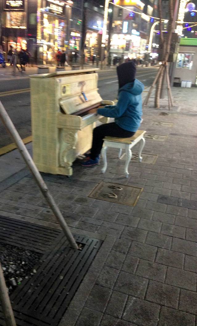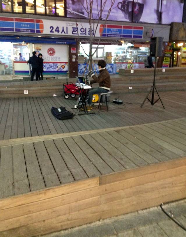 吃完晚饭散散步散到弘大那边,想感受一下传说中的夜市氛围,可是可能太早了,有点清净呢,街上没什么人,只看到小舞台这里有两个小哥在拍乐器准备表现的样子,也有可能是我们没走到中心地带,想去弘大也是的盆友可以查查具体路线,人都聚集在哪,据说有酒吧街..?