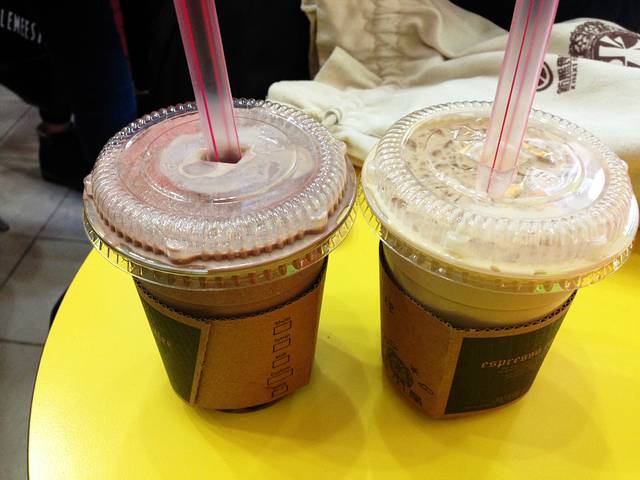 两杯都是冷饮,杯子有穿衣服o(* ̄▽ ̄*)o左边是柿子拿铁,右边是五味子冰茶