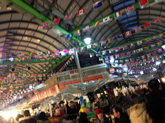 从光华门广场出来就晚上啦,来广藏市场吃晚餐。1号线钟路五街站8号出口直走,同样是外面冷雨,里面热闹非凡,人太多啦!~\(≧▽≦)/~