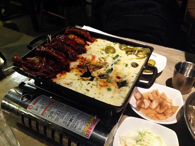 去找传说中的芝士排骨,2号线江南站11号出口出来直走,第二个路口(多乐之日面包店)右转,直走约5分钟左手边就是木盆芝士烤排骨店了