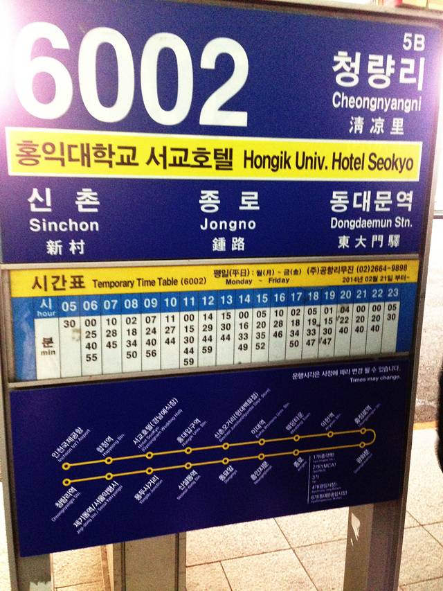 上车之前会有大叔帮你搬行李到车下面的行李舱,会问你去哪,要提前看好车下面这个站牌,不会读名字就抄下来给大叔看吧,大叔会在你的行李上贴一个纸,有编号的,另一半你拿着,到站下车的时候把纸给司机大叔,他会帮忙把你的行李找出来,(真是细心又有序~)在梨大站下,车程将近一个小时,离民宿也是非常近。还有别的交通方式去市内,地铁、出租车什么的,选择地铁应该是最便宜的,但应该要换乘什么的,想到初来乍到还是直接点好o(* ̄▽ ̄*)ゞ 。
