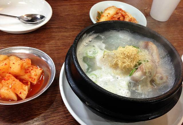 午饭吃参鸡汤,点了一碗汤加一分海鲜饼,非常撑!ps:结账出示优惠券可以打95折,所以是26600韩币。