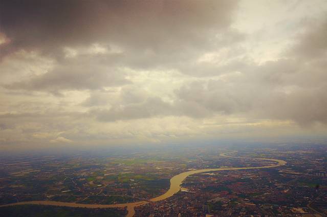曼谷,湄南河?飞机上的拍摄,黑压压的云层,天气似乎不太好。