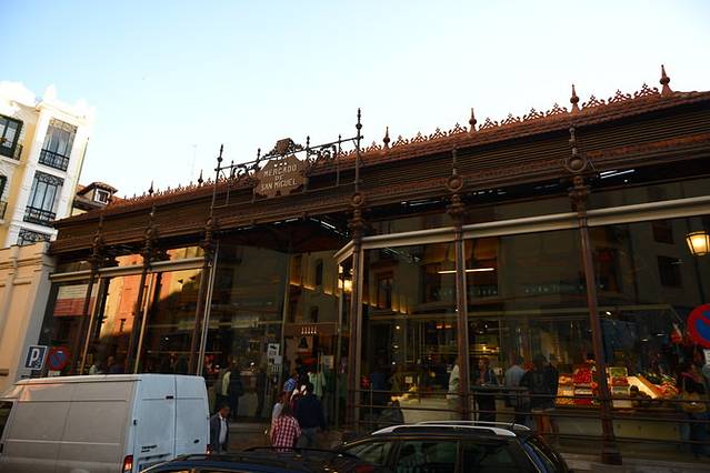 从丽池公园坐地铁返回到酒店附近,已经是晚上近9点半了,可是这里地处西欧低纬度地区,又是初夏时分,所以金黄色的夕阳依旧热情的不肯落下,玩了一下午,肚子也有些饿了,于是我们就此杀奔传说中的美食圣地---圣米盖尔市场,晚上9点半看着落日吃饭,也算是第一遭啦。