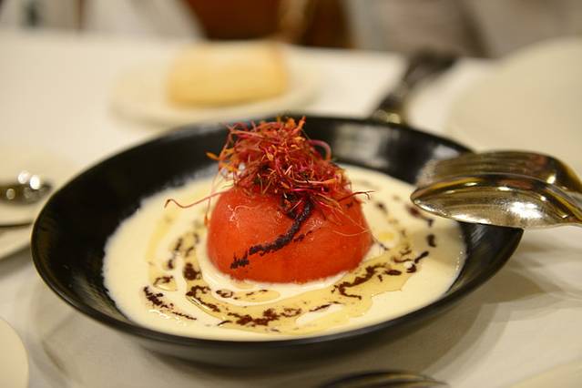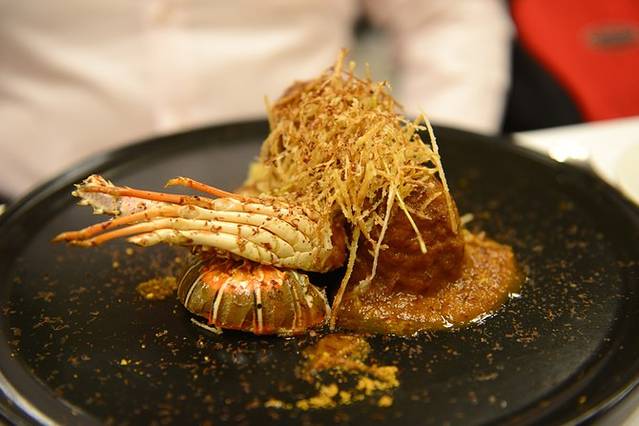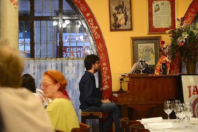 庆六一,晚餐预订了有名的四只猫餐厅^_^不过这家有些小文艺的餐厅里并没有四只猫。历史上的四只猫餐厅是传播现代主义文化的聚集地之一,毕加索就是在这里第一次举办了他的作品展。餐厅内墙上贴满人物合影、画作,有一个帅哥在餐厅一角弹钢琴,喜欢楼上小小二人雅座,空间狭小,却别有味道。名气响了人气旺了,店家态度就显得傲慢,食物价格贵,品质却令人失望。番茄冷汤别有特色,但奶油喝多了就有些腻,中国胃还是更偏爱热汤~我这份鱼倒是不错,可以吃出来肉很新鲜,量也大,边上配的煮豆子亦软糯可口,不过请原谅其实我并不知道这是什么鱼,肉质口感和鳕鱼差不多,但纹理不同。某人那道龙虾鸭胸应该属于加泰罗尼亚特色美食“山与海”(我理解是海里游的和陆地上跑的搭配),可这鸭肉也太老了吧,嚼不动啊!隔壁桌那美国大叔豪爽地点了瓶好酒,消费500大欧~霸气!饱餐后我们步行去了圣家堂,之后又坐地铁去了巴特罗之家,显然,夜幕下的教堂并没有夜幕下的巴特罗之家那般精彩迷人。