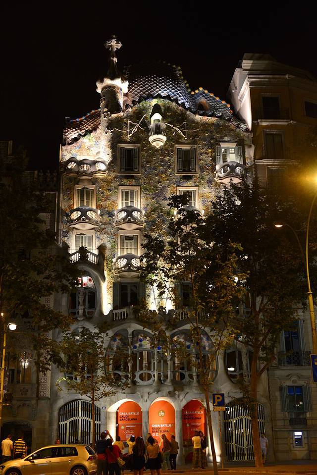 玫瑰花阳台有摄影服务,这是从公寓外部向阳台的角度拍摄,虽然一张照片要12欧,但个人认为还是值得的。对了,我们参观巴特罗之家的前一天,《花儿与少年》剧组也在这里做节目,剧组成员在阳台上的集体留影还被贴在墙上展示呢^_^在巴塞罗那的第二天夜里,我们再次来到巴特罗之家,夜幕下的公寓如鬼魅般神秘。
