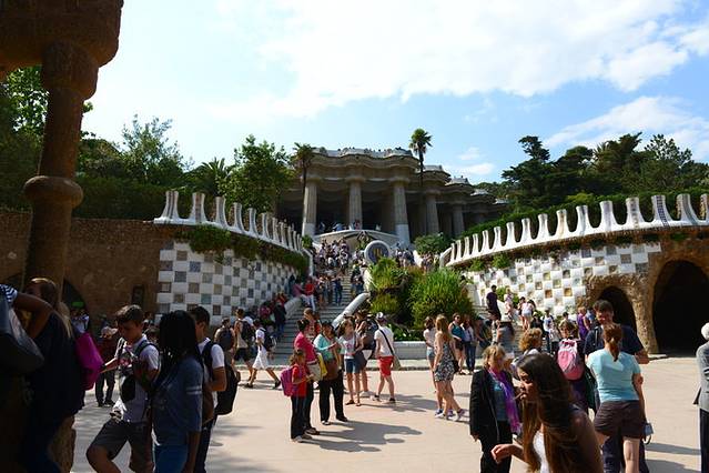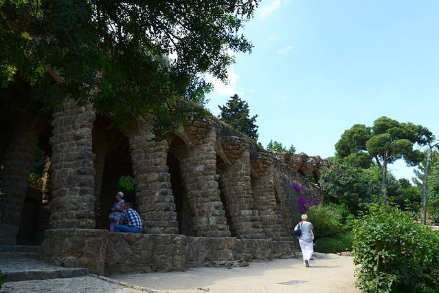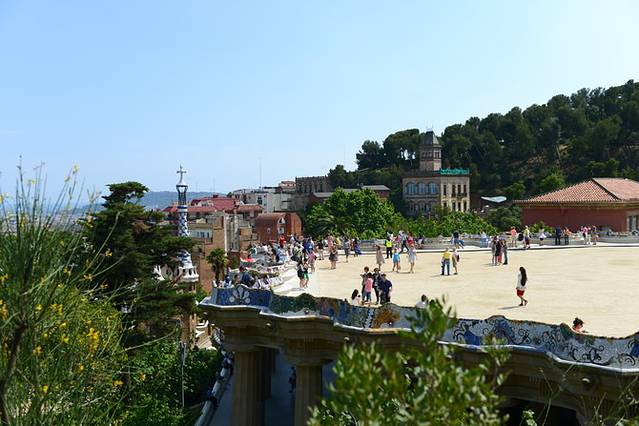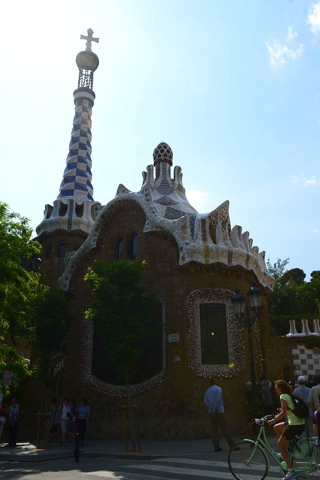 回酒店稍作休整,我们出发去古埃尔公园。根据网上推荐,L3线坐到Vallcarca站,爬几段坡到山上,不是很累,因为后面两三段有自动扶梯,这个公园入口没有售票处(太不科学了!),映入眼帘的就是好多巨大仙人掌!然后跟着其他游客一路向公园里面走,先是蛮长一段下坡路(一路上卖艺的人很多),后面可以看到高迪设计的有蜥蜴长椅的露台,然后是粉红色小房子(高迪故居),还会路过一个可爱的儿童乐园^_^一路走走停停拍拍,近2个小时后我们到了售票处,却被告知只能买2小时以后入园的票了(限流)!悲了个催的~果断走人!腿都要断了T_T就这样,我们没有能真正欣赏到古埃尔公园的精髓:蜥蜴长椅那里没能进去,门口的蜥蜴雕塑都没看到~不过我们在高处俯瞰了巴塞罗那城,也算不错的体验。从正门出来也要走一段不短的路才能到地铁站,体力耗费不小~