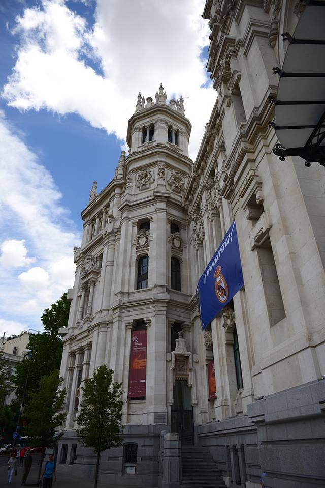 随着人流我们先到了有马德里心脏之称的太阳门广场,广场上热闹非凡,街头艺人们表演着各种杂耍和人体雕塑,逗得孩子和游客们哈哈大笑。市政厅门口的墙上挂着两件巨大的皇马和马竞足球队队服,提醒着人们周六晚即将举行的欧洲冠军杯决赛。广场东北角上代表马德里的小熊抱橄榄树铜雕吸引了大批游客合影留念。正中央的卡洛斯三世铜像跃马扬鞭,俯瞰着这座自己创建的广场上悠闲地享受着阳光的人们。