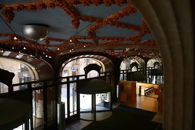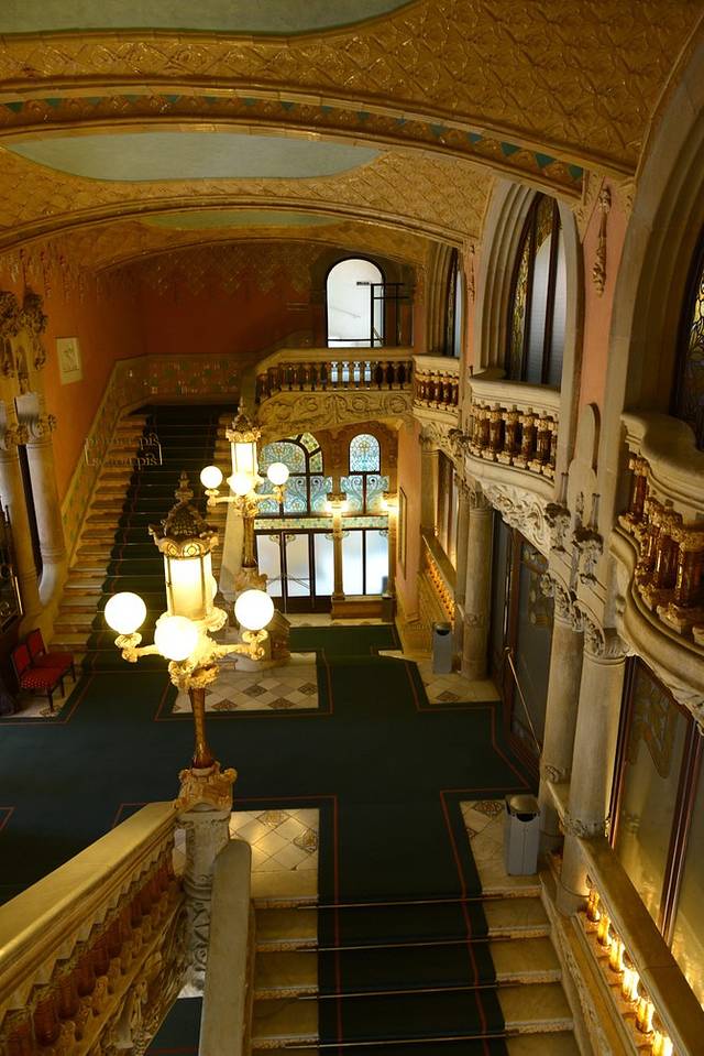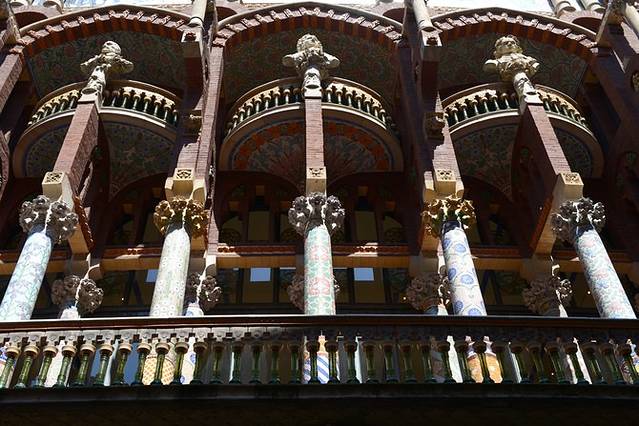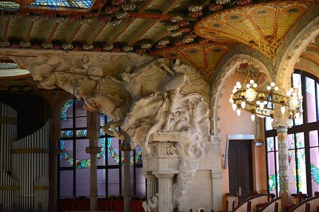 从圣家堂边的地铁站出发,换乘L1线到Urquinaona站,我们来到了加泰罗尼亚音乐厅。这座音乐厅是另一位设计家蒙塔奈尔于1908年建造完成,有梦幻般的“道钉屋”之称,列入联合国世界遗产名单。参观音乐厅必须由讲解员带领,不同语言有不同的时间段,每一个参观团(限制人数)只能参观45分钟(包括10分钟左右的短片观看),票价不菲(按每分钟参观的价格计算),这些收入主要用于音乐厅的维护和修缮,还有工作人员的报酬。比起单纯的参观,在这富丽堂皇的音乐厅里听一次音乐会或看一场弗拉明戈演出,是更为值得的选择。我们参观时正巧碰到晚上演出的团队在彩排,随意找个位子坐下,静静聆听吧!耳朵享受的同时,眼睛也不要休息^_^音乐厅内部设计美轮美奂,穹顶吊灯如万花筒般绚烂多彩,华丽又不乏大气;雕塑、彩绘、装饰与梁柱、墙面巧妙搭配,正是这色彩与结构的完美结合使得建筑内部的光线无比柔和。一刚一柔,视觉与听觉的双重享受。