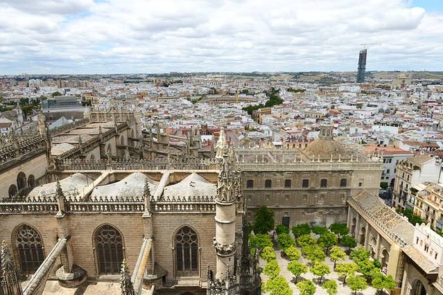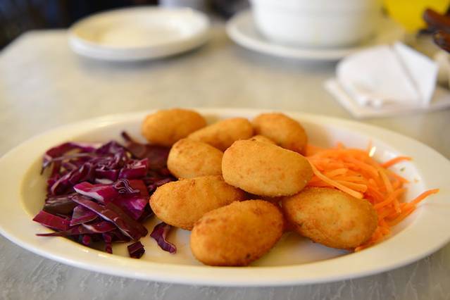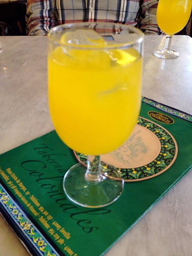 午餐去了塞维利亚百年老店TabernaColoniales,有两家分店,我们去的那家在主教堂附近,离前一天晚上去的那家霸气的Tapas店不远。还没到午餐营业时间,店里已经坐满了人,有趣的是虽然厨师还没上班不能点主菜,但可以点小食和饮料。我们照例来了盘伊比利亚火腿,入口后觉得品质比科尔多瓦那盘差太多,一片火腿有太多肥腻的部分了,味道也没有之前那家的好,价格倒是差不多。之后点的食物口味也不尽如人意,鳕鱼球显然不是整块鱼肉制成,而是打成鱼胶后加了面粉,口感粘腻,很失望;鸡肉色拉很大一碗,配的是油醋汁,鸡肉也不少,但油醋汁调得太甜,不合我的口味。