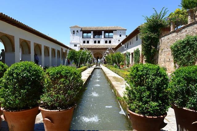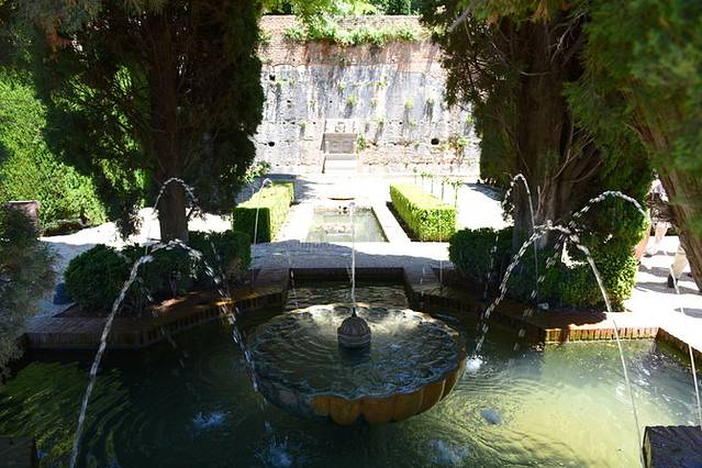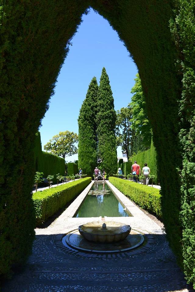 30路巴士飞快地盘山而上,不一会儿就到了阿尔汉布拉宫门口,还没到下午2点,门口排队等着入宫的游客已经不少了。游客中心就在地下一层,有卫生间和好几台自动贩售机,提供水和零食让游客补充体力,还有热饮贩售机,1欧一杯热咖啡。入口处对面有家私人经营的小店,卖冷饮和水都很贵。凭票入宫,可以买语音导览(4欧/台),但没有中文版的,听下来觉得其实没必要买,介绍得相对简略。语音导览处的工作人员想得周到,会根据游客预约参观纳塞瑞斯皇宫的时间推荐不同的游览路线。我们预约的参观时间是下午5点,他推荐我们先参观轩尼洛里菲宫 (Generalife,也叫夏宫),然后依次是阿卡萨巴碉堡(Alcazaba)、卡洛斯五世皇宫(Palacio deCarlos V),最后参观纳塞瑞斯皇宫,再由另一条路返回阿尔罕布拉宫的入口处。