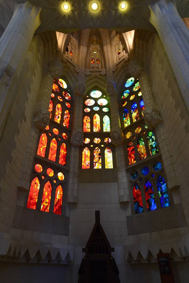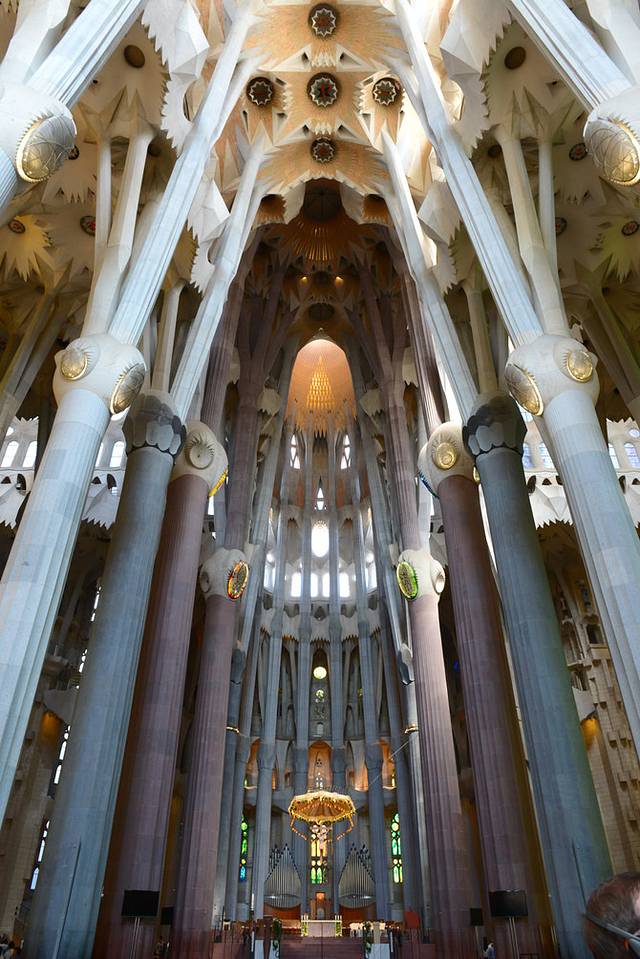 圣家堂有“诞生立面”(Nativity facade)、“受难立面”(Passion façade)和“荣耀立面”(Glory facade)三个立面,每个立面都会建有四座钟塔,共计十二座,分别代表耶稣的十二宗徒,建筑的中央另有六座高塔,其中四座代表马太、马可、路加以及约翰,一座代表圣母玛利亚,一座代表耶稣。整座建筑完成了将近50%,预计在2026年完工,现在游客们可以参观的是“诞生立面”和“受难立面”:“诞生立面”以耶稣诞生为主题,以欢喜愉悦的雕塑为主。“受难立面”以基督死亡为主题,棱角分明的线条代表苦难,雕刻了由最后的晚餐到耶稣被钉十架直至升天的故事。立面雕刻也凸显了浓厚的自然色彩,很多形象的设计以动物和植物为蓝本。高迪认为,“直线属于人类,而曲线归于上帝”,在他设计的公寓里我们也能深刻体会到这一点。圣家堂的设计以螺旋、锥形、抛物线、双曲线等各种线条组合而成,使这座神圣的建筑充满生命力。进入教堂参观可以租借语音导览,有很强大的中文版本,吐血推荐!