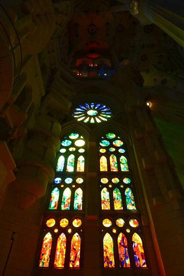 之前网上购票时预订了登塔(只能选择一座塔,诞生立面和受难立面任君选择),因为诞生立面的塔是高迪生前完成的,我们选择了从这个立面登顶。根据预约时间找到电梯口,排队等候工作人员引领(记得诞生立面电梯口附近就是玫瑰园雕刻,语音导览里有该讲解点)。塔顶形状错综复杂,用各色花砖来装饰,每个塔尖上都有一个围着球形花冠的十字架,塔楼楼梯狭小曲折,小心步行而下,必须互相谦让,偶尔有空间可探出身子俯瞰巴塞罗那城,但视野有限,对了,从螺旋楼梯俯拍有迷人效果^_^跟着语音导览慢慢游览整座教堂内部,树状结构的立柱们令人叹为观止,阳光透过彩窗玻璃照射进来,整座教堂闪耀着神圣光彩。