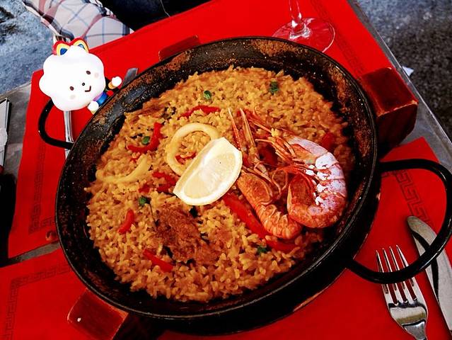 跟着语音导览参观完整座教堂大约需要一个半小时,这时已是下午2点半,我们还没有午餐,也觉得有些累了,于是到广场附近觅食,看到一家名叫EL FORO DE TOLEDO的餐厅,露天位不错,好多游客都点了海鲜饭,大大的铁盘,米饭色泽诱人,便欣然落座:来到西班牙,怎么也得尝尝招牌海鲜饭吧~之前听过许多关于西班牙海鲜饭的评论,褒贬不一,我觉得,一盘好饭最重要的是饭不可夹生,也不能太湿润。其实西班牙海鲜饭(PAELLA)的配料并不只限于海鲜,还可以是肉类或蔬菜,当然也可以HALF-HALF,肉类用的较多的是鸡肉,还有一种加了墨鱼汁的,如果你不介意从嘴唇到牙齿再到舌头都变黑的话。我们选了最大众的原味海鲜饭,配虾和青口贝,大份的12.75欧,许是小城人民淳朴,这样价格的海鲜饭我们在马德里、巴塞罗那都没有见到过,在大城市,有些餐厅一人份的海鲜饭都要15欧,令人瞠目咂舌~这家餐厅海鲜饭味道不错,饭粒的软硬度和干湿度都符合我们的要求,配料不算多,但此时有美味米饭配上迷人阳光就已足够,再来一扎特色饮品Sangria,满足!
