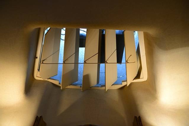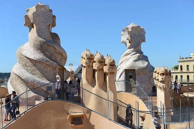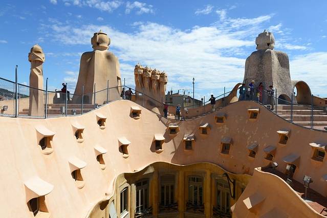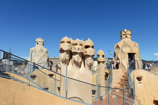 排队购票的队伍也不短,且分现场购票和网上购票两支队,都挺多人~好在上午10点大部队还没到,排了15分钟左右就能进去了。可以购买语音导览,但没有中文版(光这点就比不上巴特罗之家和圣家堂),体验后认为英语介绍相当简略,没有购买的必要。米拉之家的天井、六层、顶楼和屋顶阳台对外开放,先乘坐电梯到屋顶阳台参观,神秘的人头面具里隐藏着整座建筑的水箱和通风设施。