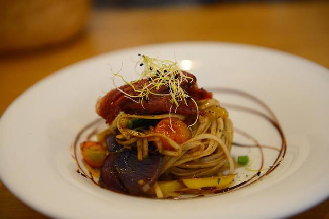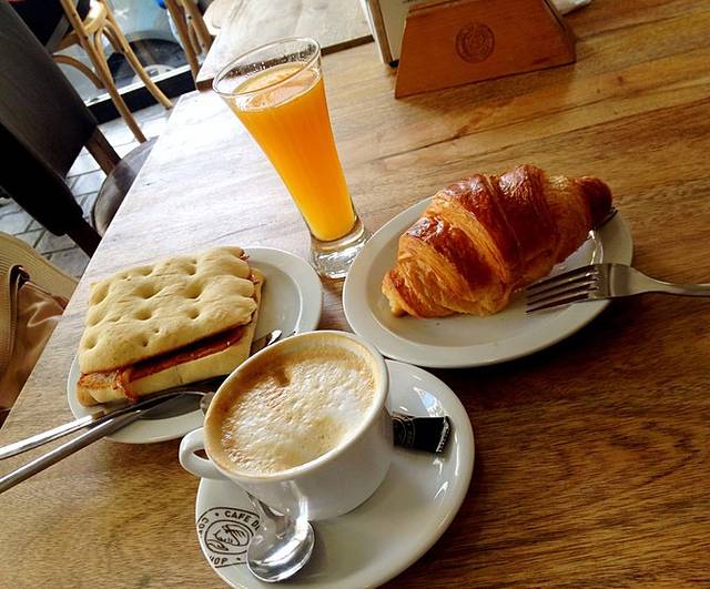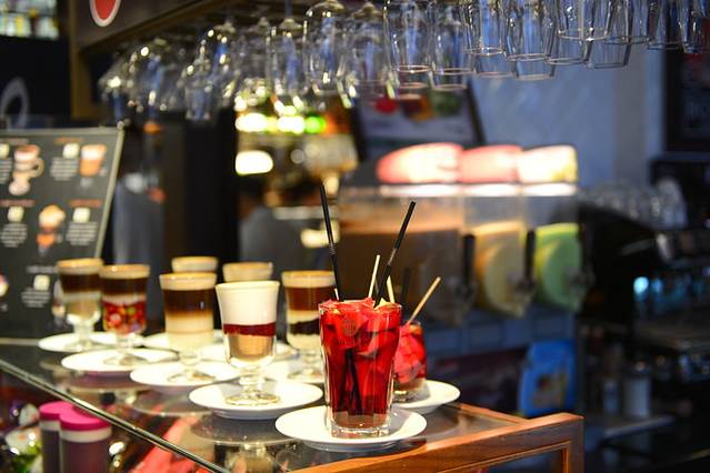 到了巴塞罗那才知道加泰罗尼亚地区有着自己的语言,和在马德里以及西班牙南部地区听到的西文差别不小,就连地铁站标识“出口”的表述也不一样(Salida&Sotida)。不过巴塞罗那会说英语的人稍微多些,旅游城市嘛~吃饭基本没碰上因为语言引起的尴尬局面。巴塞罗那的第一顿午餐,我们根据网上的推荐去了一家叫Tapas 24的餐厅,这家餐厅在Corte Inglés附近,沿着Gracia大道步行过去会路过巴特罗之家。下午1点到的时候餐厅人满为患,排了大约40分钟才得以落座(比起魔都吃饭排队那还是有差距的)。用餐区分露天的和地下室的,露天区的人们似乎很享受阳光,久久不愿离去,我们只能坐在地下室Tapasbar前面窄小的单人圆椅上,背包也没地方安置~逼仄的用餐环境让我们有些失望,但很快美味食物给我们惊喜:猪肉土豆球、伊比利亚火腿配西班牙煎蛋(柔嫩的蛋皮里包裹着软糯的土豆块,口感绵密而满足)、小锅炖牛肉、加泰罗尼亚地区特色的番茄末橄榄油配脆脆的面包片,来一杯啤酒,餐后再喝一杯illy咖啡,绝对满足!餐食分量不大但也能不至于一会儿就饿,还是为晚餐留点肚子吧^_^