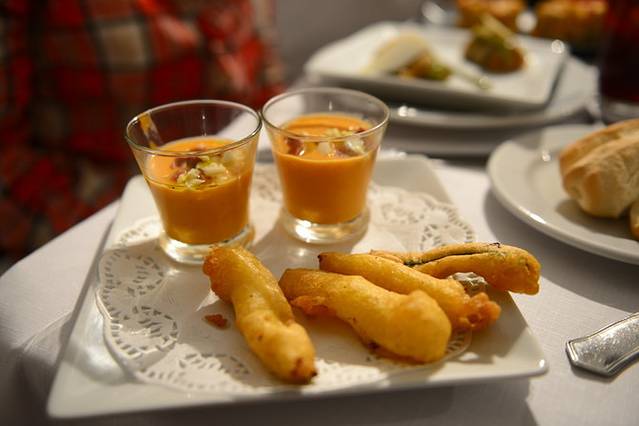 Tapas的做法和日本寿司差不多,各种新鲜食材放在面包片上,一、两口下肚,视觉与味觉的双重享受(后来我们在Tapas最出名的塞维利亚又吃到了创新版和快餐版两种,各有特色)。面对如此美食,当然只有一个字,吃!我们点了三文鱼刺身、番茄包猪肉卷、伊比利亚火腿等几种Tapas,又喝了由白兰地混合了水果汁、柠檬片调制而成的西班牙特色果酒Sangria,大快朵颐了一番,真真是鲜美入味,心满意足;特别值得一提的是,由于游客实在太多,大家都没有地方可以坐,于是一个个靠在档口小吧台上站着吃,也算是一大景观。