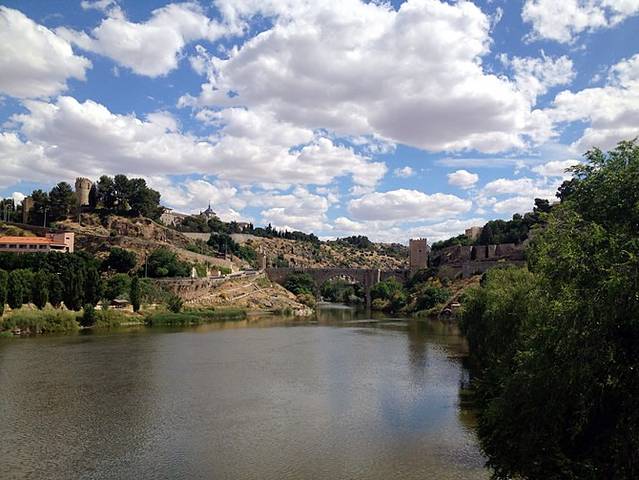 不疾不徐地用完午餐,已近下午4点,而载我们回马德里的火车是5点半发车。我们选择了另一条路回火车站,这条路可以经过托莱多城的正门——比萨格拉门,门上刻有西班牙国王卡洛斯一世的帝徽,然后是塔霍河,能够远望到我们早上进城时走过的圣马丁桥。迷人景色、微微清风,此时相机没电罢工都不能坏了我们的心情^_^手机留下一张塔霍河倩影。
