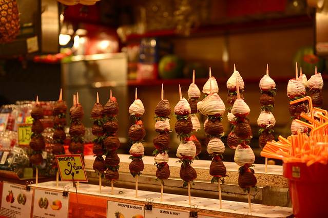 来到圣米盖尔市场,迎面而来的是一座四方形全封闭玻璃建筑,踏上台阶进到其内,才发现与其说它是一个市场,不如说更像一条室内小吃美食街,一家家档口在售卖着各种美食,有果酒Sangria、鲜榨果汁、甜品和西班牙最著名的Tapas。