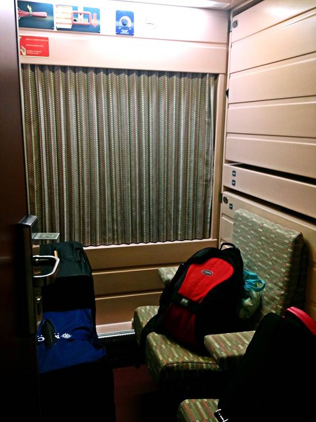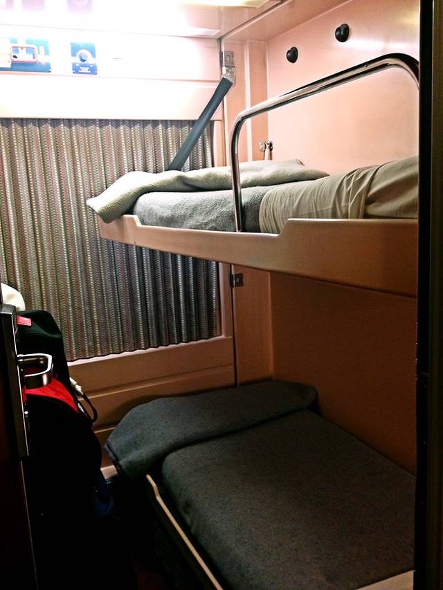 这是我第一次坐夜火车。晚上9点半从格拉纳达出发,第二天早上8点半到达巴塞罗那,买的双人包间,票价较贵(112欧/人),但为了安全和省时间,也是值得的。慈祥的列车员老伯认真检票,把游客们送到相应的包间里,二人包间不大,放了行李后坐在位子上,腿就没法动了,不过好在这一晚我们可以躺下。床铺是双层格局(座椅翻下来就是下层床铺),时隔多年又回到了大学时代^_^卫生间还带个简易冲淋房,不过水温较低。晚上11点左右,老伯应该把整车人的票都检完了,他就会到包间里来帮旅客把床铺翻下来(自己无法操作,需要专门的工具),亲切道一声“Good Night”。枕头、被子比想象中舒适很多,劳累了一天,简单梳洗后就躺下了,令人高兴的是火车行进时噪音也不算大,一夜安然无梦。