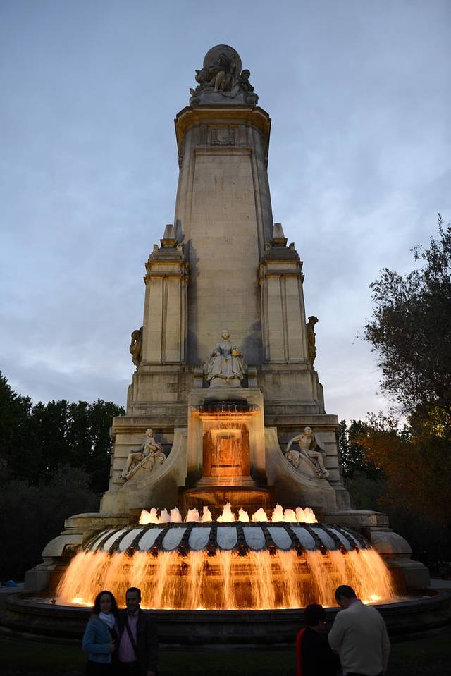 这里的太阳下班晚,满足了嘴巴的我们决定去西班牙广场看看。西班牙广场离太阳门广场不近不远,可以坐地铁,但步行过去也能接受。走在路上发现人出奇的少,原来这个时间点正好是万众期待的皇家马德里与马德里竞技队同城德比欧冠决赛,视足球为最爱的马德里人无不拥坐在街边小酒馆里观看直播;步行来到西班牙广场,广场中心是塞万提斯纪念碑,前方是堂吉诃德和桑丘的铜像,四周绿化不错,还有个喷泉,但说实在的比较失望,这个广场更像街心花园,不能同塞维利亚的西班牙广场相提并论,而之前网上看到有人说那里可以看到最美的日落,可直到太阳完全落下,我们都没能找到那个可以看日落的地方,累觉不爱。回到住处已经很晚,奔走一整天,沾了枕头就进入梦乡。
