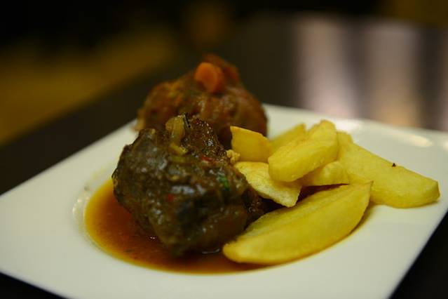 走出博物馆已是下午2点半,饥肠辘辘,附近觅食,正巧路过一家叫TIPS的餐厅,就进去了。在西班牙吃饭,最怕遇到不会讲英语的店家,这家就是,点餐真是痛苦,只能点了这家餐厅最近推出的一款意粉(因为有图片)和半份BBQ猪肋排(还好点了半份,那量真是大啊),另外点了份热巧克力(谁知道厚得像吃巧克力酱),可这家店不卖西班牙油条,遗憾。意粉味道很淡,猪肋排倒是肉质和口味均佳。