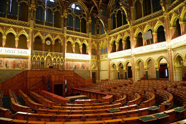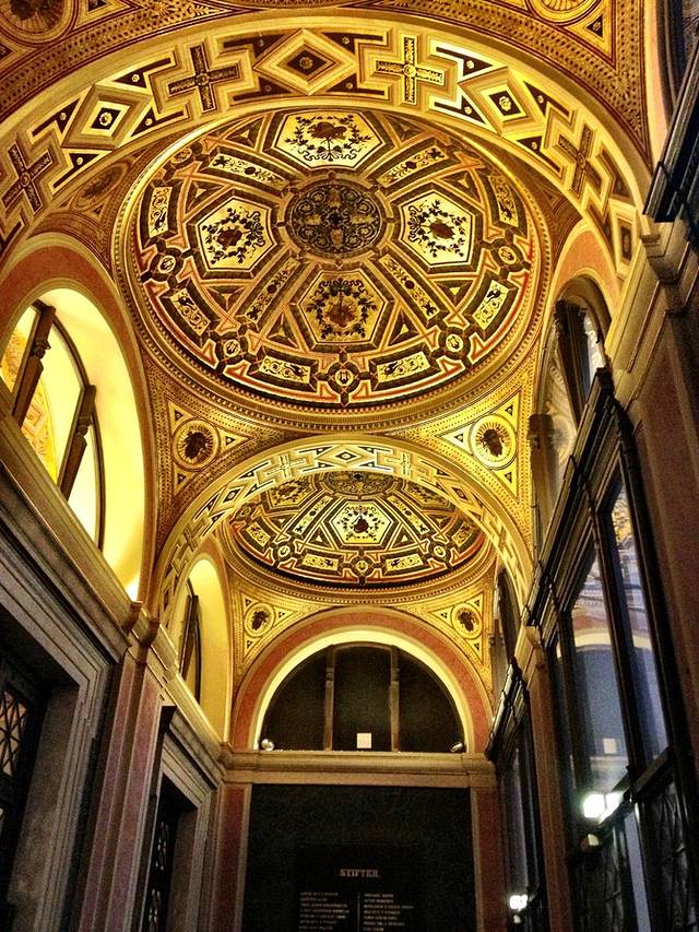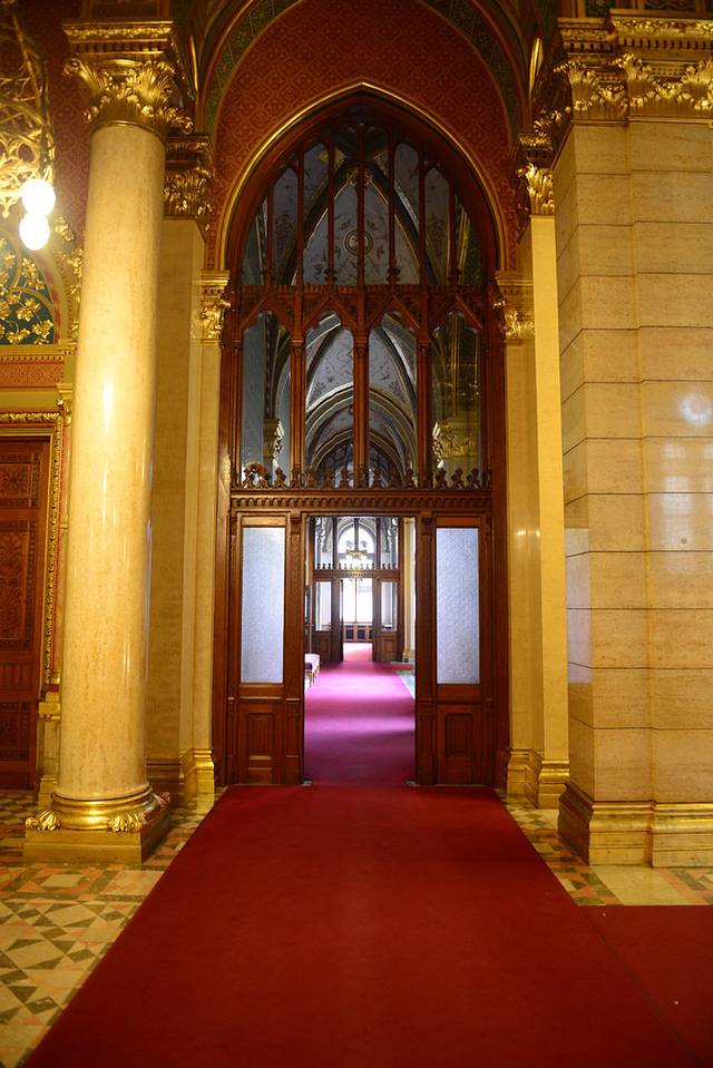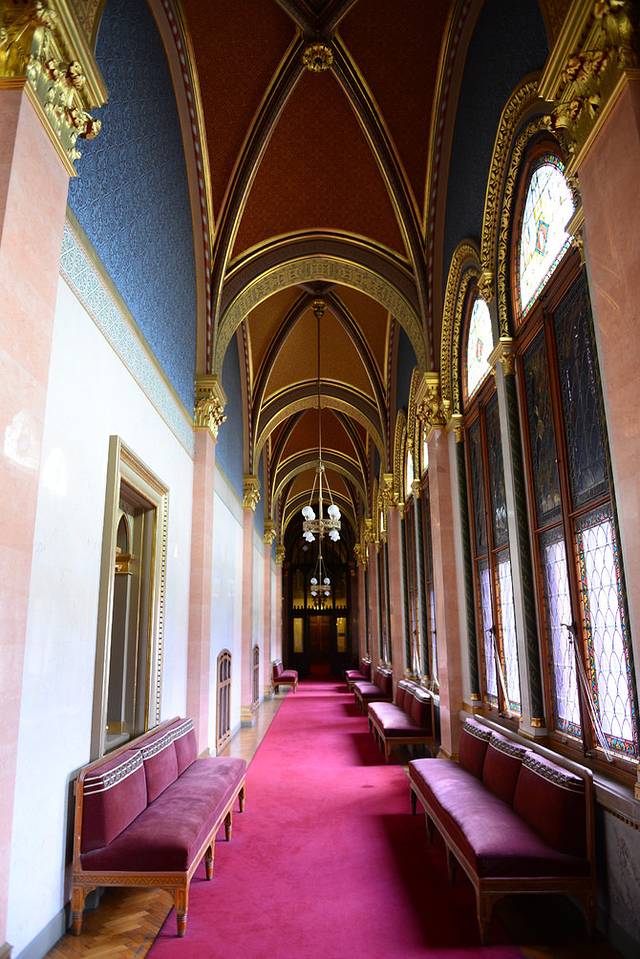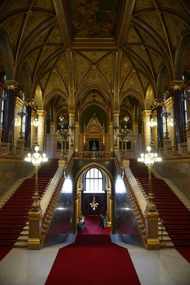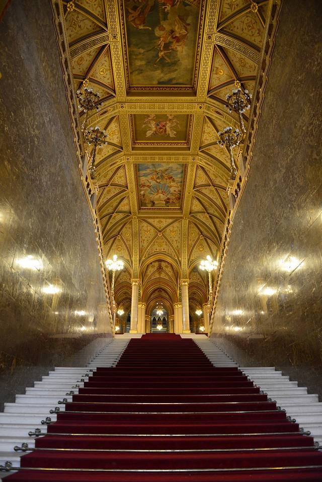 3点15分左右,我们终于被放进去了!接待我们的英语导游是一位和蔼可亲的老太太,端庄知性,穿着亮丽的枚红色套装,幽默风趣,让人倍感亲切,不过她的英语口语我听不习惯(某人嘲笑我明明自己英语听力不好还怪人家有口音)作为欧洲大陆第一大国会大厦,这栋建筑富有匈牙利传统风格,内部装饰着大幅壁画和历史人物的雕塑。里面有一间房间是不允许拍照的,那里收藏着金光闪闪的皇冠。
