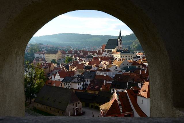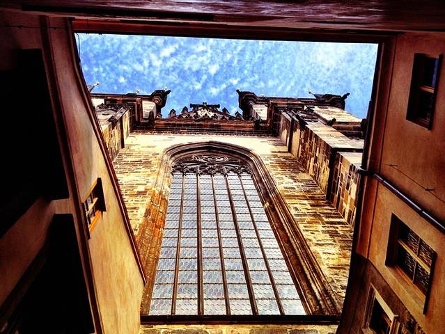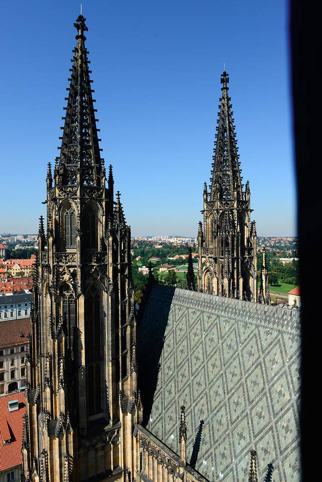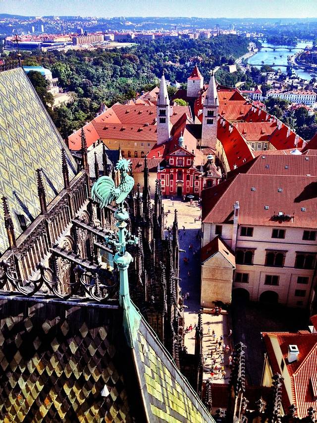 在布拉格城堡,我十分推荐的一个登高点就是圣维特大教堂东塔。在这里登高需要另外购买门票,150KC/人,但绝对值回票价。当然,在此处登高颇考验体力,东塔狭小而高,旋转楼梯转得人头晕,上下同一通道,需要不时地后退避让他人,某人背着很重的摄影包,真心是磨炼啊