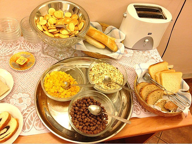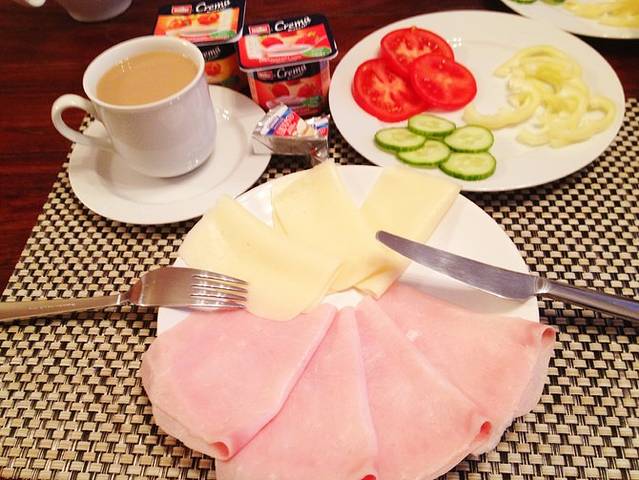 回到旅馆,在地下小餐厅享用早餐。由于旅馆规模不大,早餐的品种很少,但对我们而言已经足够。谷物配酸奶、奶酪、芝士、火腿和烤面包,我最爱的欧式风格。负责餐食的旅馆工作人员是位可爱的女士,笑容甜美,态度温柔,时不时地从厨房出来看看食物的量是否充足。我们在这家旅馆吃了三顿早餐,在这小小的餐厅里邂逅了几对来自不同国家的外籍游客,最后一天很巧,遇到了独自旅行的上海男士,攀谈了几句,我们向他推荐了在布拉格一日游的线路,后来在CK小镇的城堡上我们又相遇了,真是奇妙的缘分。