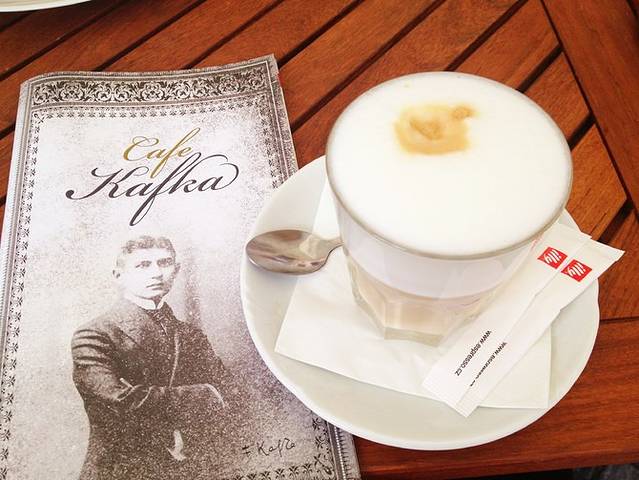 从火药塔下来,两人都觉得疲惫,想来是没有吃午餐到底体力跟不上啊!于是沿着街道步行至老城广场,在著名的卡夫卡咖啡馆坐下。这家CAFE之所以用卡夫卡的名字命名,是因为大作家卡夫卡生前一直在这家咖啡馆写作。
