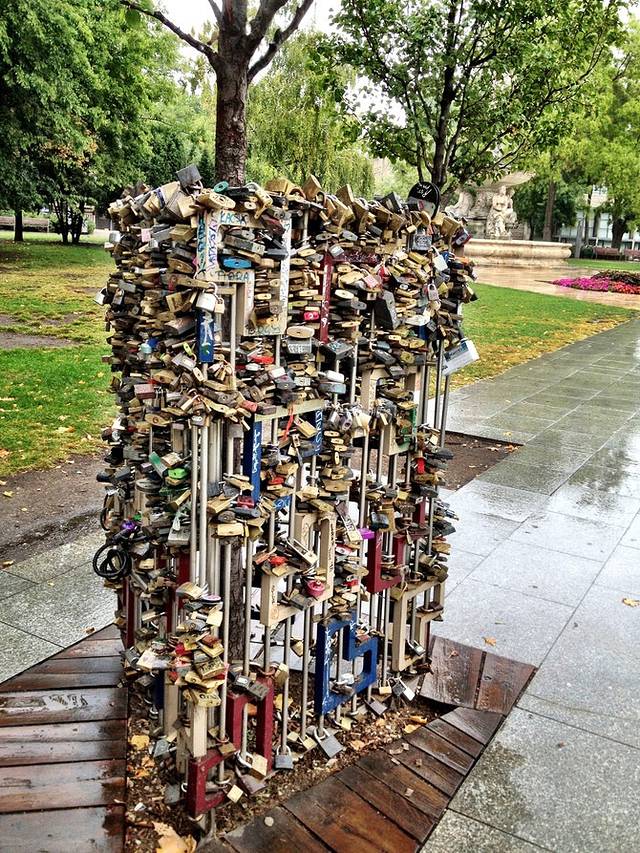 免费厕所上完,看看窗外,雨似乎小了很多。早就预约了下午三点参观匈牙利国会大厦,总是要出门的,于是两人一合计,不如先去网上推荐的国会最佳拍摄地看看吧!(BOOKCAFE共消费约3000多FT,服务费也会计入总账。)国会大厦的最佳拍摄点坐地铁2线到Battyhany ter站下来是最近的,出站就是,但我想时间还早,不如再走一遍链子桥,于是我们还是地铁M1换M3到链子桥边,这时雨真的小了,游人也多了起来,我看到对面城堡山下的小火车站,有人在买票登山。过了桥沿着河岸步行,可以路过一个街心花园,四边的长椅很小巧可爱。