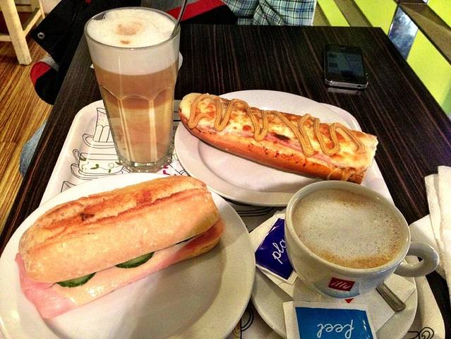美美地睡了一觉,醒来却发现,近10天积累的RP终于用完了 窗外大雨滂沱,我们在布达佩斯只有这一天是完整的,明天下午就要去机场了~默默地把阳台上挂着的衣服拎到房间里,开始犯愁今天怎么走。。。先生说要不先去城堡山看看,说不定那里不下雨呢~嗯~于是带着伞和雨衣(经过这次我觉得雨衣是旅行必备~!尤其是那种开衫式的雨衣,很好用~比伞靠谱多了!)坐地铁M3线到Deak Ferenc ter站下,出站就能看到有一家小CAFE,旁边还有换汇点,雨很大,也别挑剔了,就在这家祭五脏庙吧!进门一看已经很多人在吃早餐了,一楼的位子早已坐满,点了两份早餐套餐:乳酪黄芥末酱吐司+拿铁、培根芝士三明治+卡布奇诺,一共人民币40元!真是很划算啊~三明治超大~经过烤箱加热后,吃起来更香!