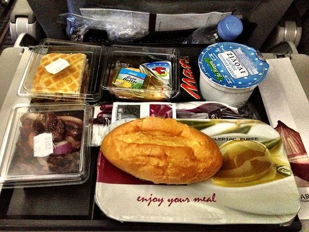 回程航班是卡塔尔航空,位子间间隔稍大,舒适很多。食物口味一般,主食不是鸡肉饭就是鱼和土豆泥,似乎飞机餐总是那么些东西。。。那杯子里的不是酸奶而是矿泉水。。。不过我很喜欢那种涂面包的小三角奶酪~