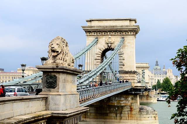 吃完早餐,外面雨稍小些,于是我们穿上雨衣撑了伞往城堡山方向进发 我们并没有坐公交车,而是跟着手机GPS步行到多瑙河畔链子桥这里,只要穿过链子桥,城堡山的登山小火车就在你面前啦!