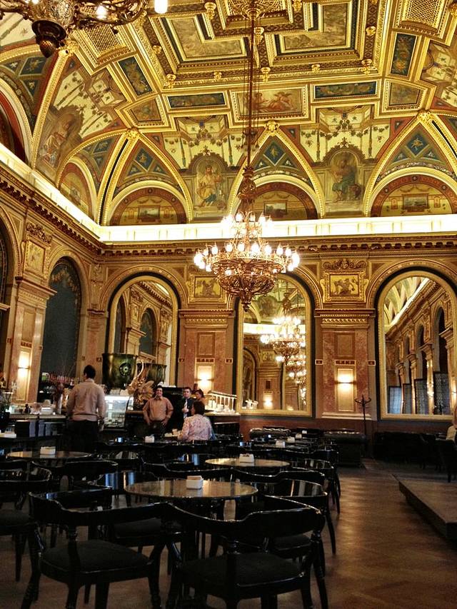 链子桥上风特别大,雨在风的推动下越来越大~根本没办法拿出相机拍照 雨天早上九点半的链子桥上,除了我俩再无他人。。。往一旁望去,那座优雅的白桥也因为灰蒙的天色而显得黯然孤单。。。过了桥走到登山小火车的入口处,雨依然嚣张,伞也抵不住大风有吹喇叭的趋势 “我们去咖啡馆泡着算了!”我脱口而出。想想也是,在这样的天气游览城堡山肯定不会尽兴,天气预报说明天将放晴,不如明天一早再来。我们达成一致,又在风雨中过了桥回到刚才我们下车的地铁站(这个站正好是M1、M2和M3的换乘枢纽)坐地铁黄线M1到Oktogon站下,再走没多少时间就能找到网上推荐的著名的书店咖啡馆(BOOK CAFE)在门口你看不到咖啡馆的招牌,看到书店就毫不犹豫地走进去吧!从宽敞的楼梯走到二楼,就是咖啡馆入口。我们到的时候恰好是早上10点,客人还不是很多,找了个舒服的沙发位坐下(哎,记得才吃完早餐没多久。。。。)