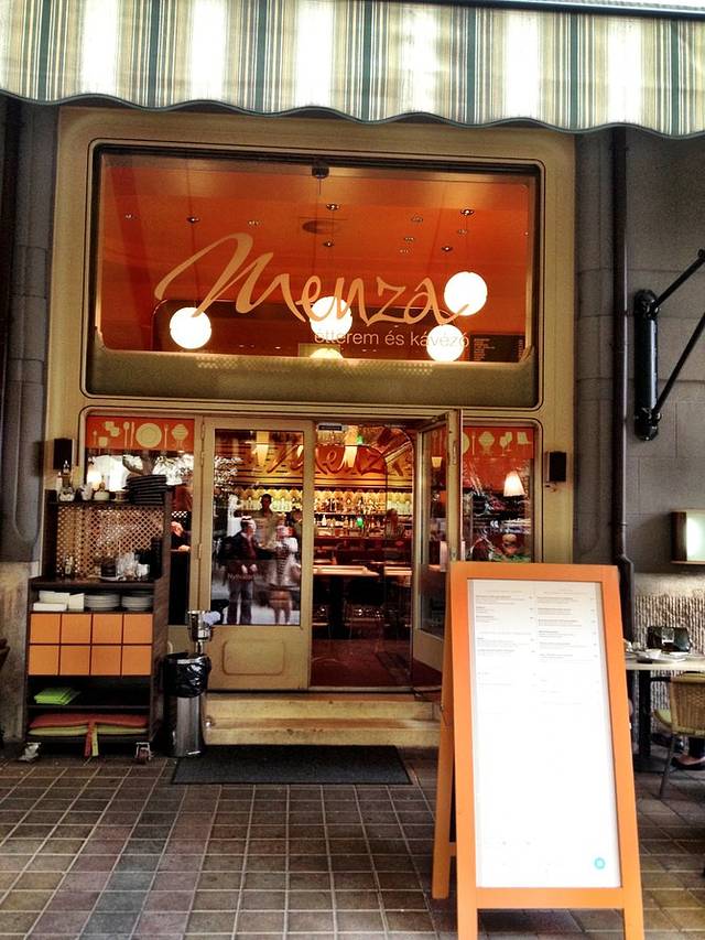 东忙忙西忙忙,一看时间已经要下午6点了~抓紧时间出门!先去网上推荐的餐厅MENZA吃晚餐,坐地铁很方便,地铁M3在Deak Ferenc ter站换乘M1,在Oktogon站下车,没走几步就可以看到一个街心花园,别犹豫,走进去吧^_^餐厅招牌还是很醒目的