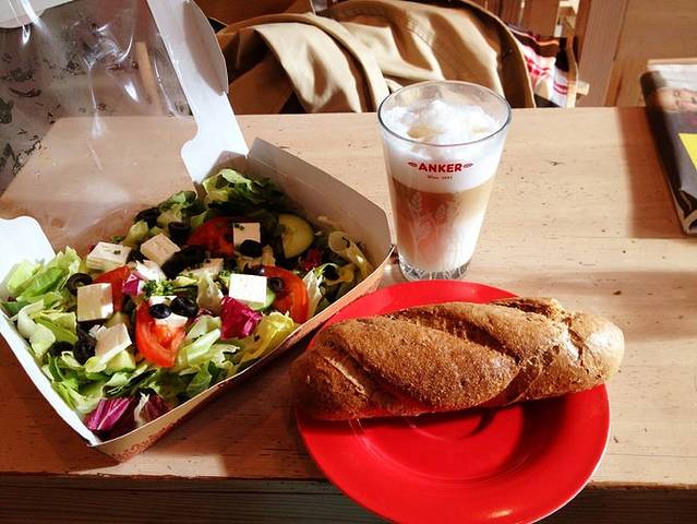 Anker面包店是连锁的,我在地铁站和街边都有看到,面包品种很多,还有色拉、三明治、各类派等点心,当然也提供咖啡、果汁等饮料。早晨有价格稍优惠的套餐,但种类不多,只有羊角面包/三明治+咖啡。连续那么多天没有好好吃蔬菜,我看到这盆有着山羊奶酪的希腊色拉两眼放光 买色拉还送了一个面包,配上一杯我认为不怎么正宗的拿铁,我已经很满足了!