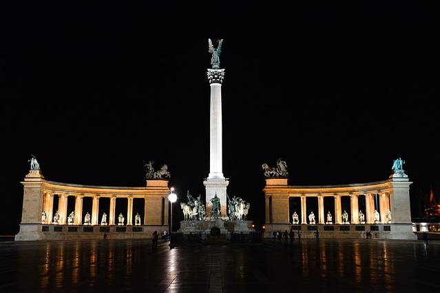 饱腹后浑身的疲乏显了出来,这才真正感受到一天下来的奔波与不易,也感恩老天的厚道,让我们能到城堡山上走一遭。慢慢步行到地铁站,对面就是著名的英雄广场,晚上9点,几乎没有游人,灯光下,英雄纪念碑分外夺目。