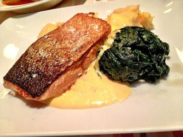 我真的好喜欢烤三文鱼旁边的那堆菠菜,好美味!三文鱼量太大,很撑~酱汁也是亮点