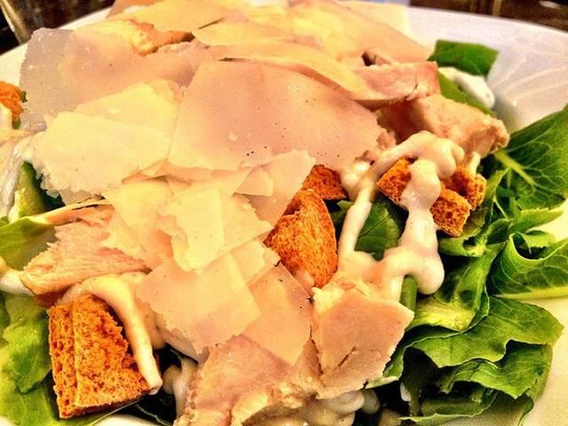 本来就不饿,食物味道不佳也就不那么在意了,窝在舒服的沙发里蹭着WIFI,看着CAFE里进进出出的人。。。大部分是避雨的游客吧~我们不停地关注外面的雨势,期盼着它小些,再小些。。。。不知不觉到了午餐时间,排队等候的客人渐渐多起来,没有什么消耗也没有什么胃口,我俩加点了恺撒色拉作为午餐,发自内心地讲,这是我吃过的最好的恺撒色拉!